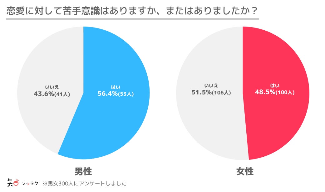 男性のオタクは恋愛への苦手意識がある方の方が多く、女性のオタクは苦手意識はない方の方が多い