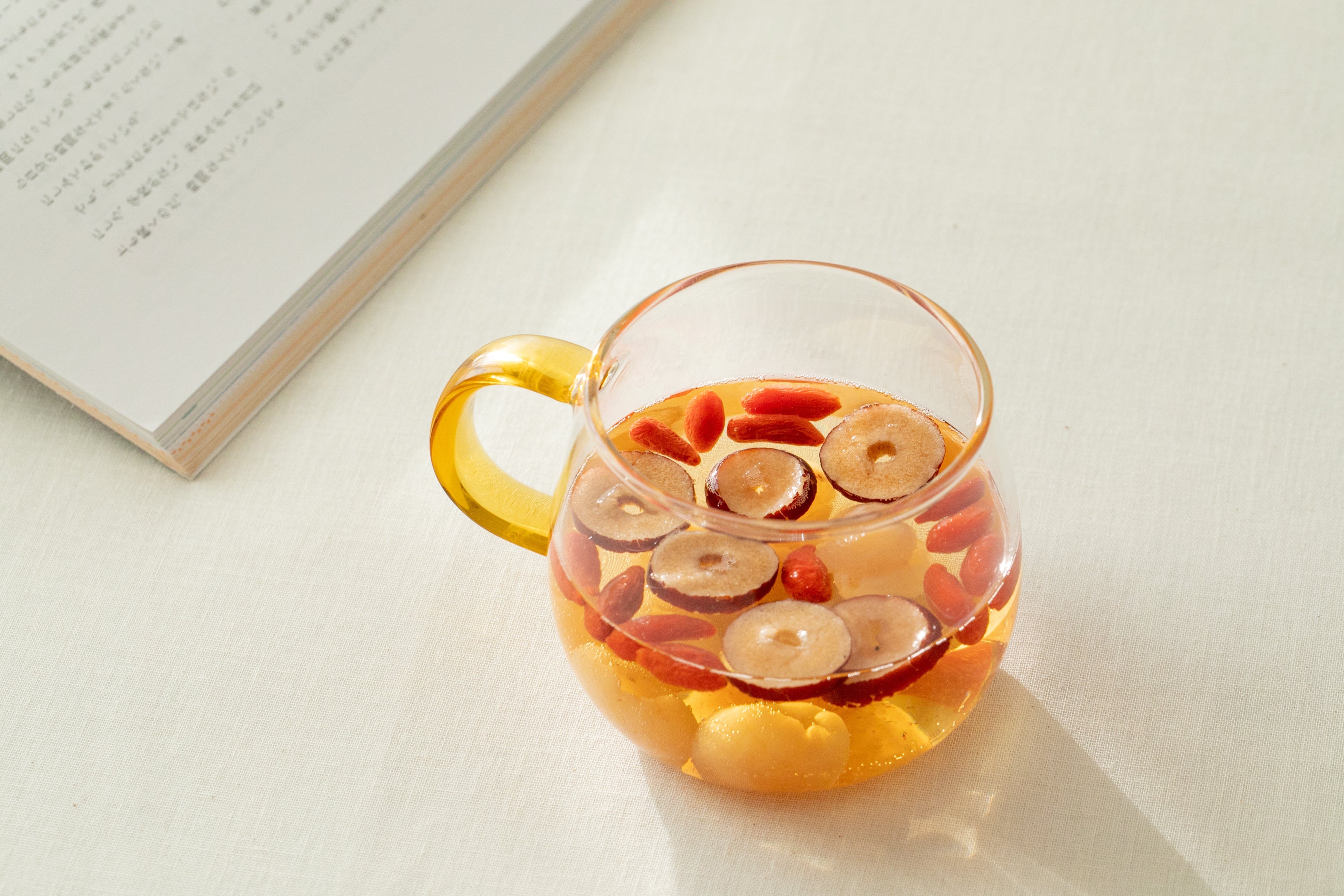 「なつめ」、「クコの実」、「ろんがん」という血巡りを促す“3つの宝物”が1つのパックに入っています。習慣づけて飲むことで、陽だまりに包まれているような身体づくりを助けます。また、飲み終わった後の果実もおいしく召し上がれます。※ノンカフェインです。