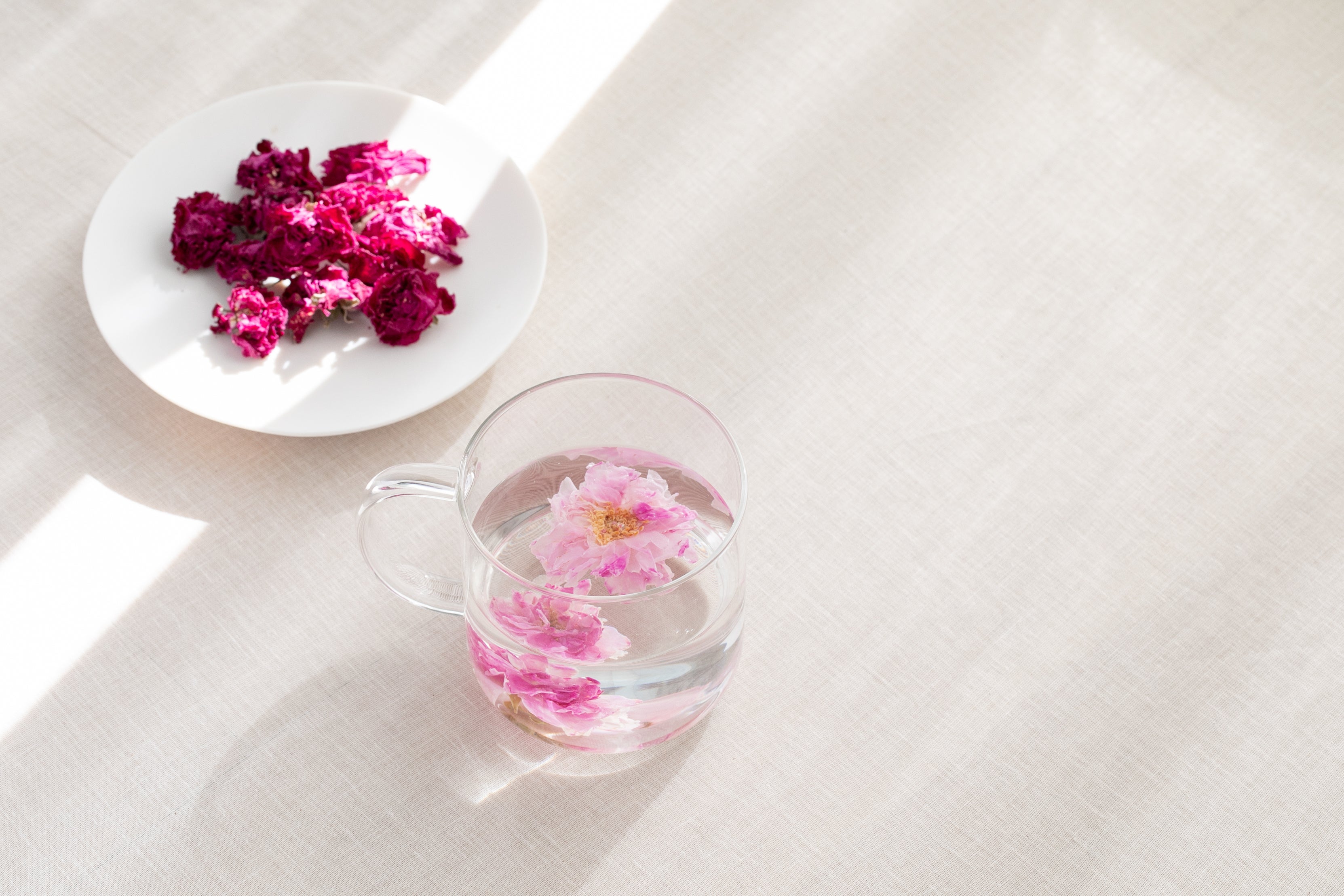 形や色、香りができるだけ変わらないように、花それぞれに合わせて独自の乾燥製法で花茶を作りました。カップやポットに入れ、お湯を注ぐと、花びらが開いて豊かな香りに包まれるノンカフェインの花茶シリーズです。