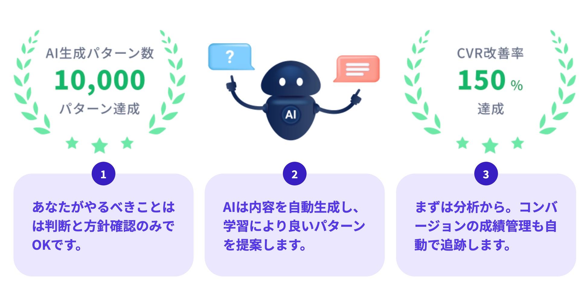 ECサイトの全商品をAIが自動分析。もっとも改善が効果的な商品の選定から、実際の改善案まで提案します。元の商品情報と改善案をABテストによって一定期間検証し、AIによる効果測定と分析をお届けします。