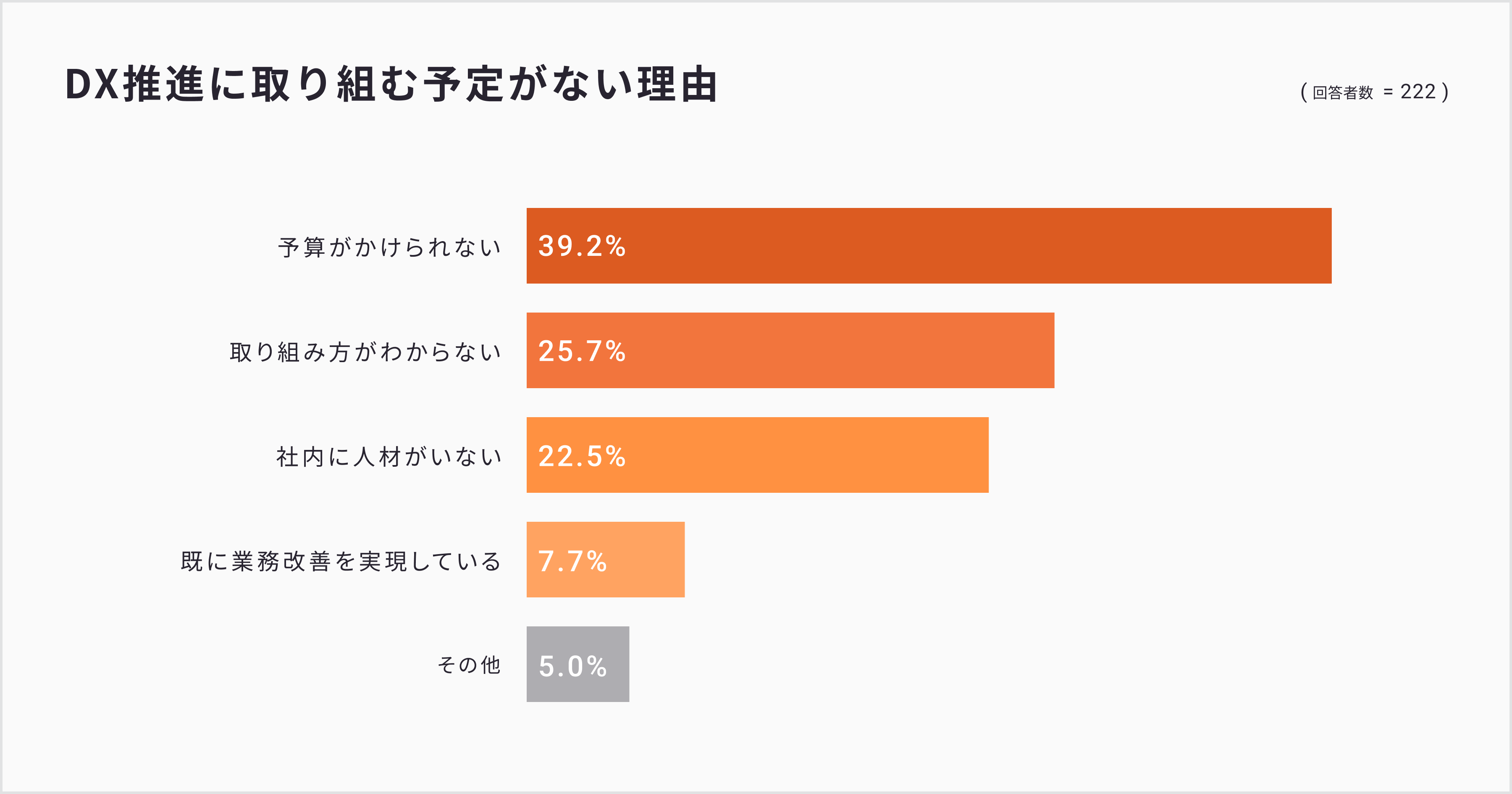 また、「DXに取り組む予定がない」と回答した企業に「取り組む予定がない理由」を確認した質問でも、ほぼ同じ課題を抱えていることがわかりました。