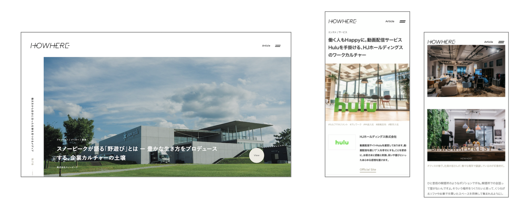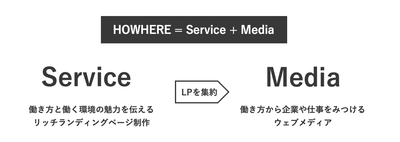 本サービスは、ミレニアル・Z世代の感性に訴えかけるデザインを入口に、「⾼品質:プロのライターとカメラマンによるコンテンツ制作」「豊かな表現:豊富な写真とストップモーション動画」「信頼性:働き方・働く環境に特化」を特徴に持ち、働き⽅に注⼒する企業のブランディング活動を支援します。また、リッチLPを集約し、働き⽅から⾃分に合った仕事を⾒つけるウェブメディア 『HOWHERE』として情報発信することで、働き方を意識する求職者と企業が出会う機会を提供します。