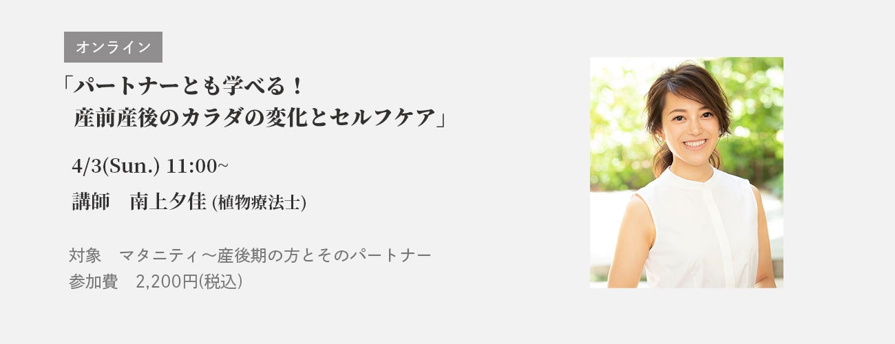 会陰まわりのオイルケア、授乳期にぴったりな吸水ブラレットから産後の抜け毛悩みに寄り添うヘアケアまで、新しい命のために変化していくママのカラダに寄り添うアイテムをラインナップ。パートナーも一緒に、ママの身体の変化にあわせたケア方法を学べるセミナーもご用意しています。
