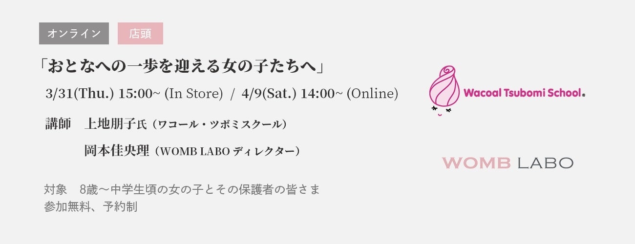 胸のふくらみや初潮など、年齢とともに変化していく女の子のカラダとこころに寄り添おう。カラダの変化を親子で一緒に学ぶ場を提供する「ワコール・ツボミスクール」とのスペシャルセミナーを開講するほか、月経を迎えるお子さまに向け、リーフレット付きの吸水ショーツセットもイベント限定でご用意いたします。