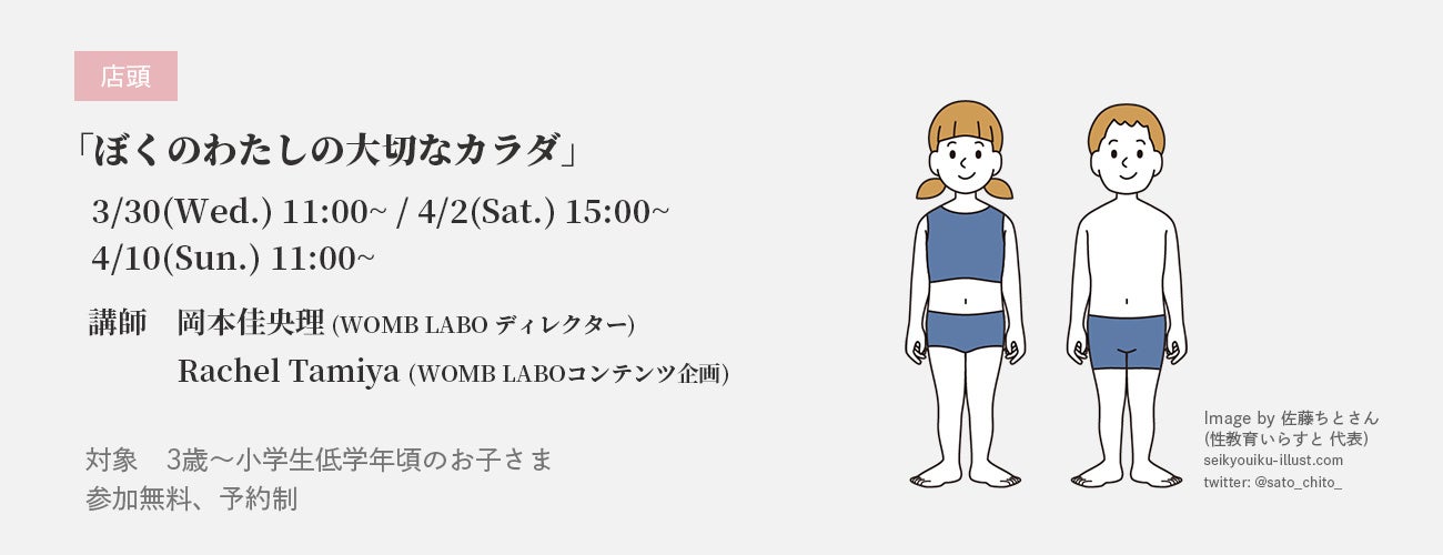 森田敦子とWOMB LABOが手がける、初の親子の性教育に特化したフェムテックイベント。産前産後期から、子供のカラダの変化にあわせて学べる4種のセミナーも。