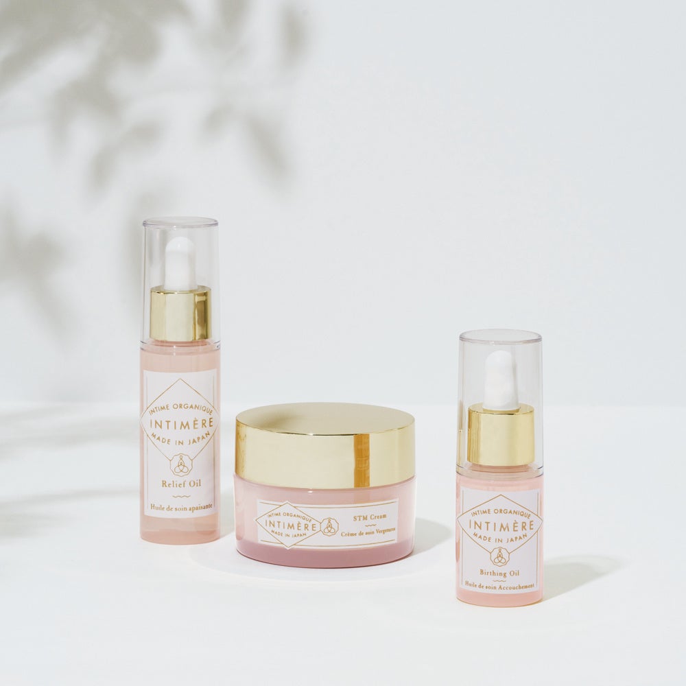 (左から)インティメール リリーフオイル 8,800円(リラックスオイル)/インティメール STMクリーム 6,600円(保湿クリーム)/インティメール バーシングオイル 11,000円(マッサージオイル)すべて税込