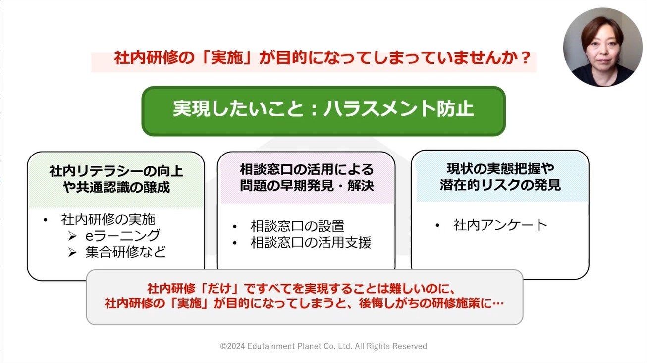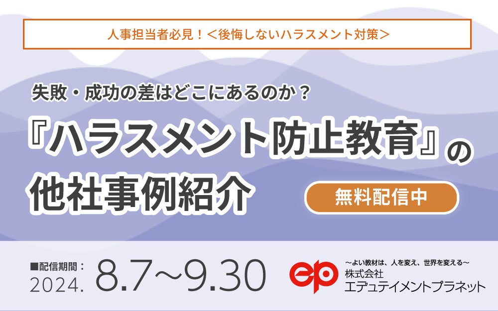 株式会社エデュテイメントプラネット(本社:東京都杉並区 代表取締役 柳田 善弘)は、ウェビナー動画「<後悔しないハラスメント対策>失敗・成功の差はどこにあるのか?『ハラスメント防止施策』の他社事例紹介」の配信を本日よりスタートしました。