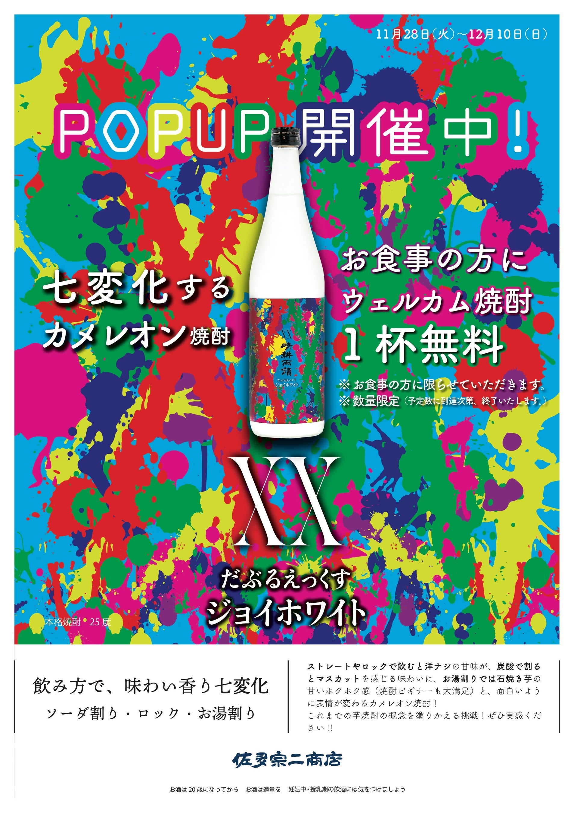 11 月28 日~12 月10 日までカメレオン焼酎“晴耕雨讀XX ジョイホワイト”を1杯無料で提供!!