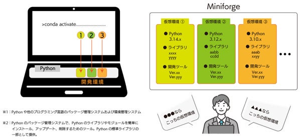 Pythonアプリケーションの環境セットアップにおいて、開発者はマシンのOS、ハードウェアやそのサポートソフトなど、多くの点を確認しなければなりません。また、1つのPython環境に複数のアプリケーションを組み込む場合、モジュール依存性のバッティングなど、多岐に渡る問題が起こり、容易に環境構築できず試行錯誤を繰り返すことで時間を要します。各Python開発環境でjupyter lab*を全て同じ環境になるように構築するには、構築に関するノウハウの蓄積が必要なため、ユーザーにとって負担が大きいことや、空いているGPUリソース を自動的に選択して効率よく使用するためには一定の知識とソフトウェア環境の調整が必要なことも課題となっていました。