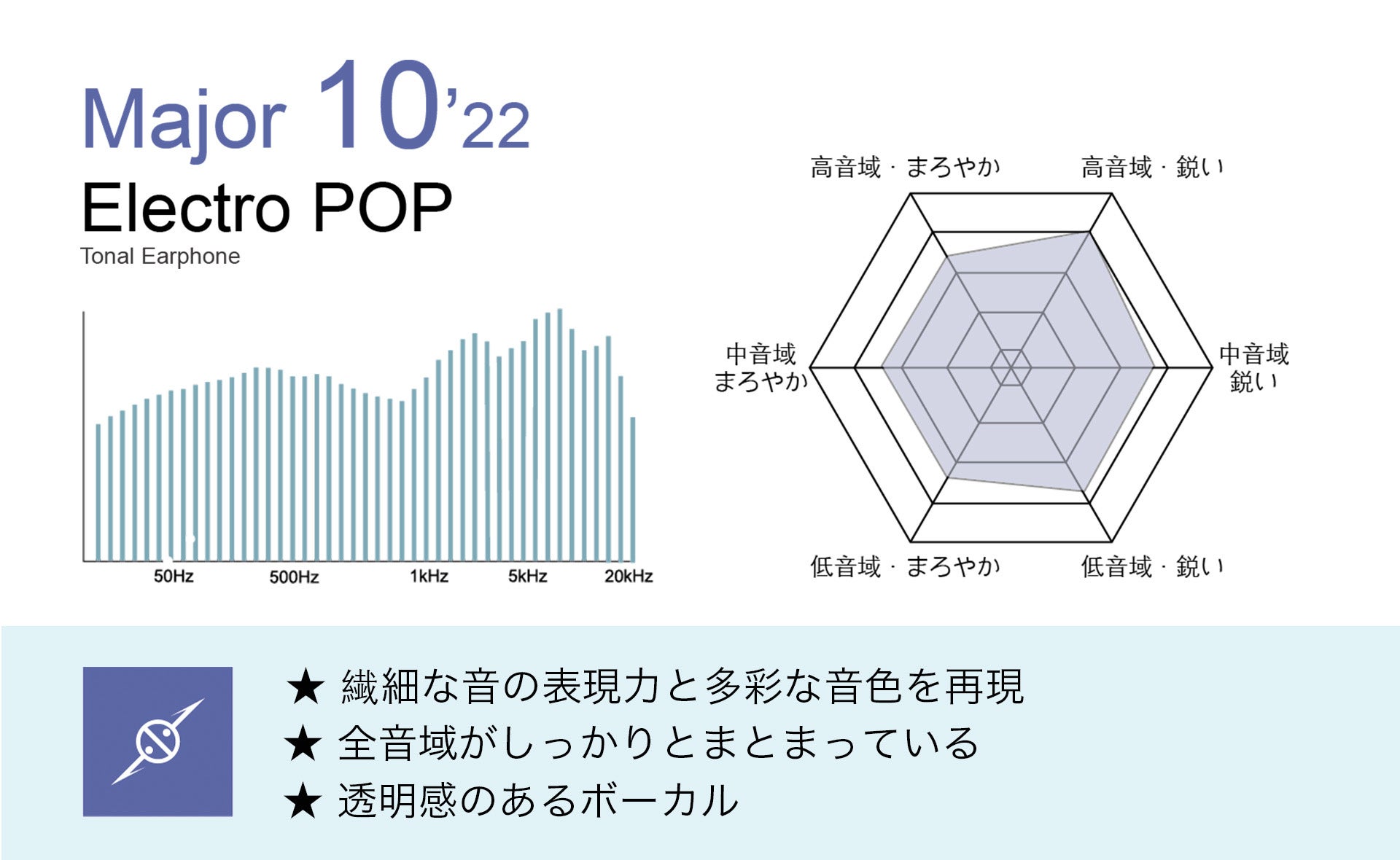 このほど発表された最新機種「Major 10’22 Electro Pop」はデジタル時代、未来的なサウンドにびったりなエレクトロポップ向けのイヤホンです。高精度な分解能を持ち、ボーカルの透明感が際立ちます。低音域の輪郭がくっきりし、繊細で艶やかな中高音域の表現、伸びやすくてキレのある高音域、と全音域がしっかりまとまります。複雑なリズムと、多彩な音色を奏でるエレクトロポップの魅力を存分に楽しめる設計です。