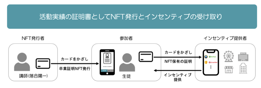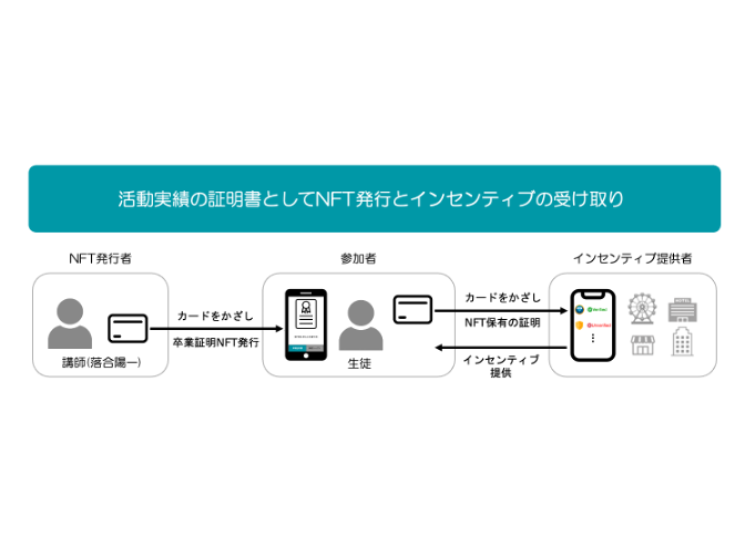 本サマースクールに参加する小学4~6年生に、受講終了後に卒業証明書をNFTで発行します。参加者は、認証用スマートフォンアプリを起動し、ICカード型ハードウェアウォレット※3をリーダー/ライター機能を搭載したスマートフォンにかざすことで、受講実績を証明することができます。将来的には、NFTで実績証明を行い、その実績に応じたインセンティブとして、大学入学や留学、就職等で活用できるようにすることを目指します。