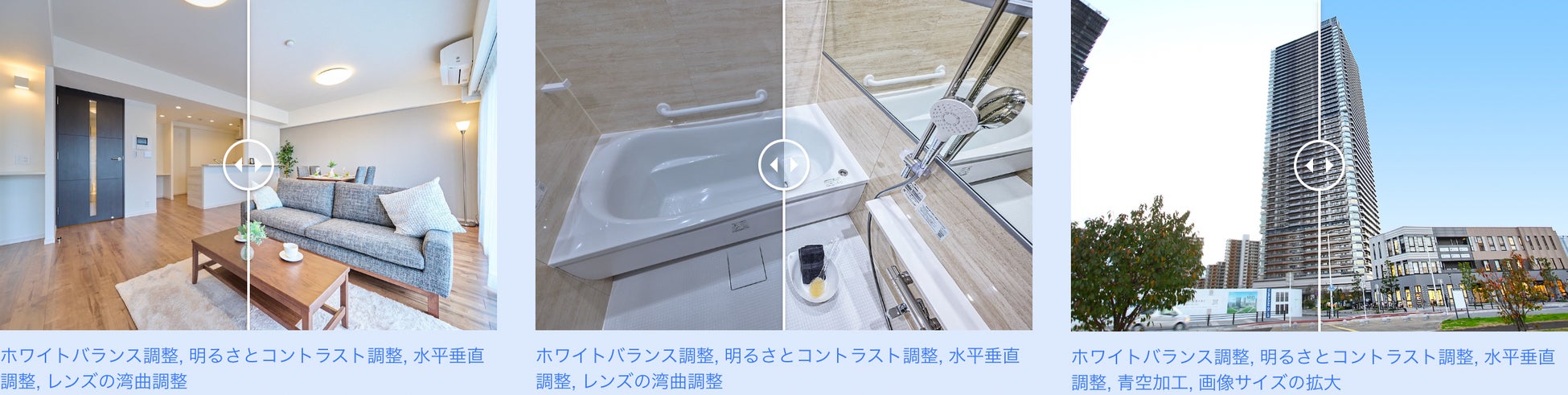 300万枚以上の物件写真加工実績を基に開発したAIで、誰でも簡単に魅力的な物件写真加工が可能に。無料編集ツールを使って編集もでき、100%のクオリティをお求めの場合は専門チームが写真加工いたします。