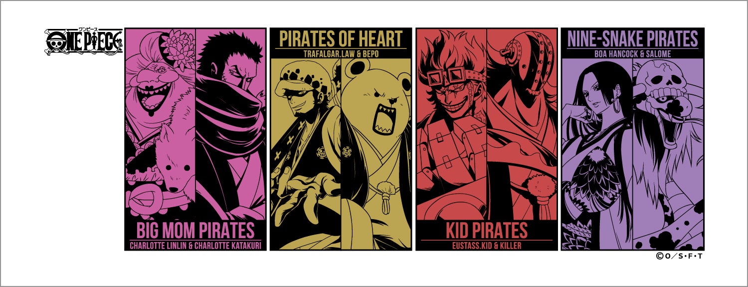 四つの海賊団より「ロー&ベポ」「キッド&キラー」「ハンコック&サロメ」「ビッグ・マム&カタクリ」が、お正月らしい和装姿で手ぬぐいに登場しました。(素材:綿100% 33.0cm×86.0cm 日本製)