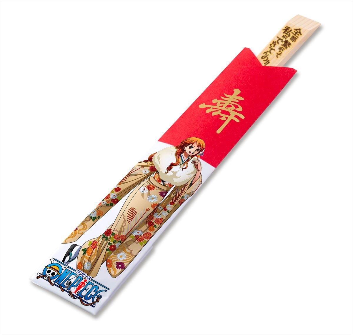 ナミの台詞をレーザー彫刻であしらった割箸。箸袋には、華やかな晴れ着に身を包んだナミがプリントされています。(素材:北海道産間伐材トド松 箸袋:紙 日本製)