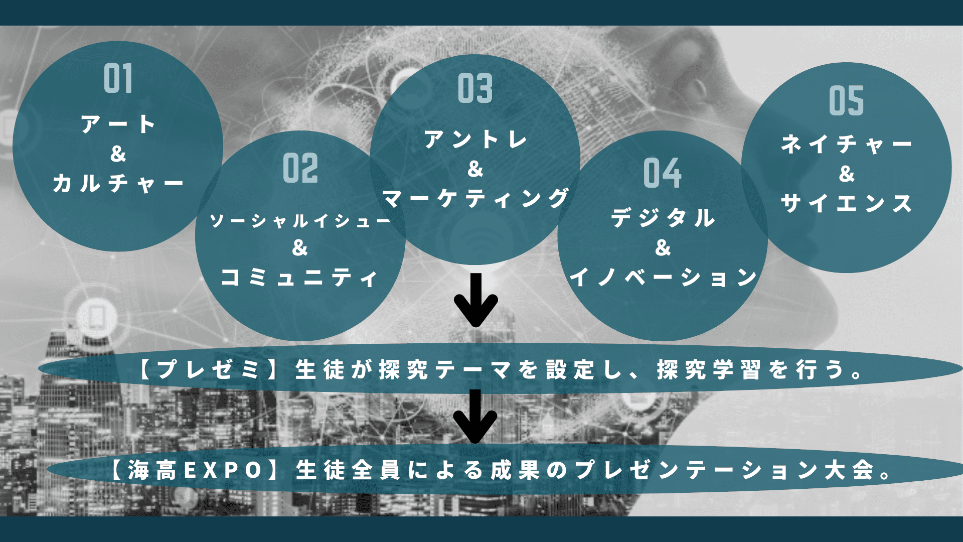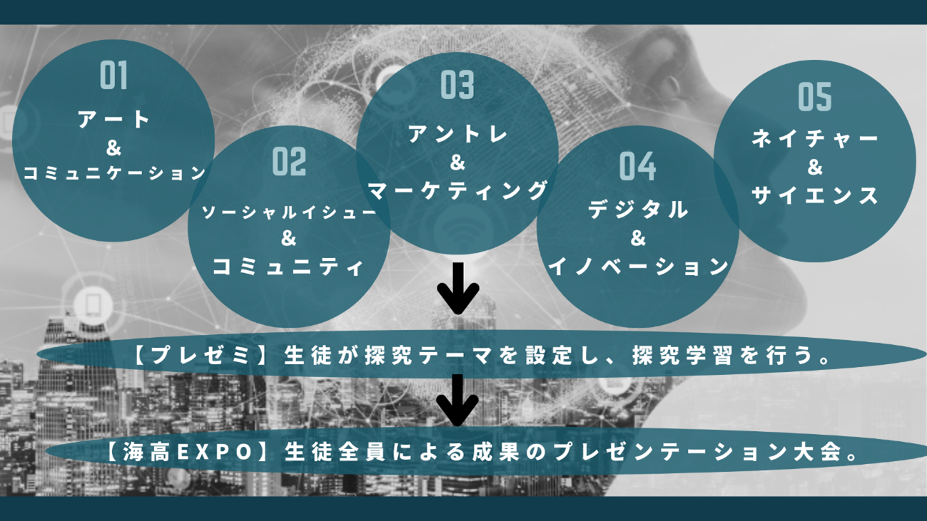今回の「海高式探究プログラム」では、BYDと各分野に精通した企業が提携し、BYDがその全体指揮を執っています。まず生徒たちは興味関心に応じて、(1)アート・コミュニケーション、(2)ソーシャルイシュー・コミュニティ、(3)アントレプレナーシップ・マーケティング、(4)デジタル・イノベーション、(5)ネイチャー・サイエンスのコースを選択し、教科学習だけでは学ぶことができない専門性の高い学びを深めていきます。その後、各自が探究のテーマを設定し主体的に学びを深めていくという、新時代の探究学習のモデルケースの在り方を生み出す試みとなっています。ぜひご注目下さい。