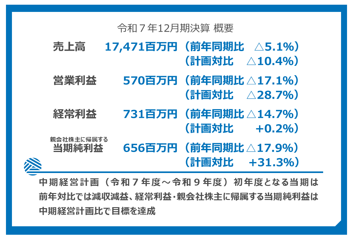 中期経営計画(令和7年度~令和9年度)初年度となる当期は前年対比では減収減益、経常利益・親会社株主に帰属する当期純利益は中期経営計画比で目標を達成