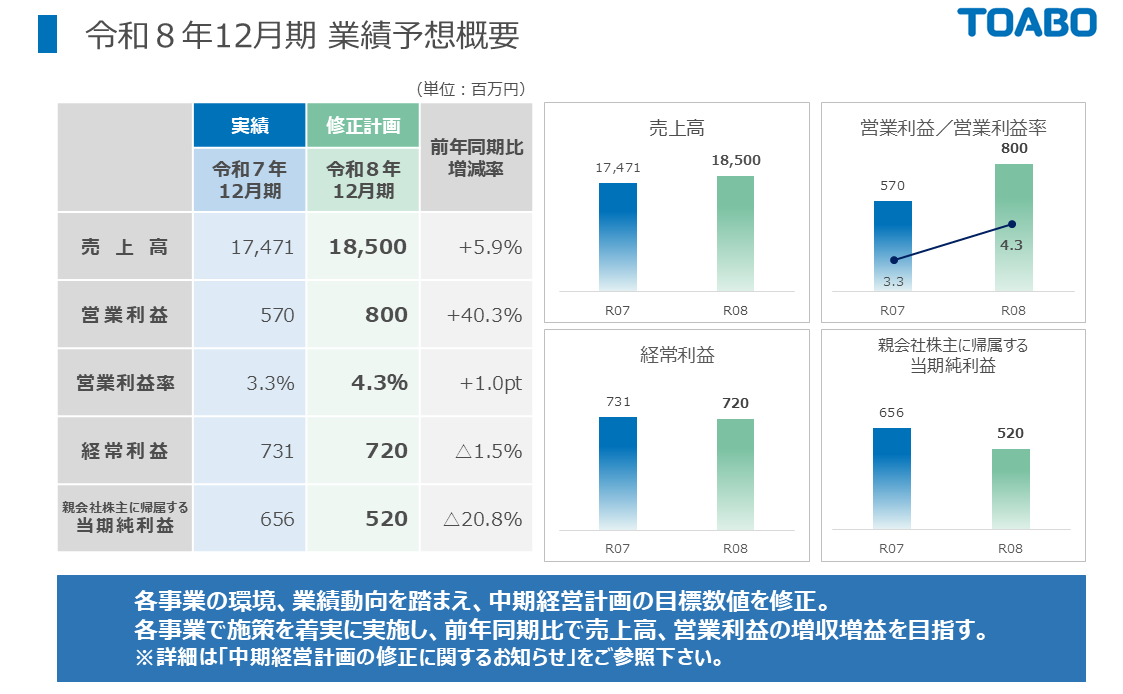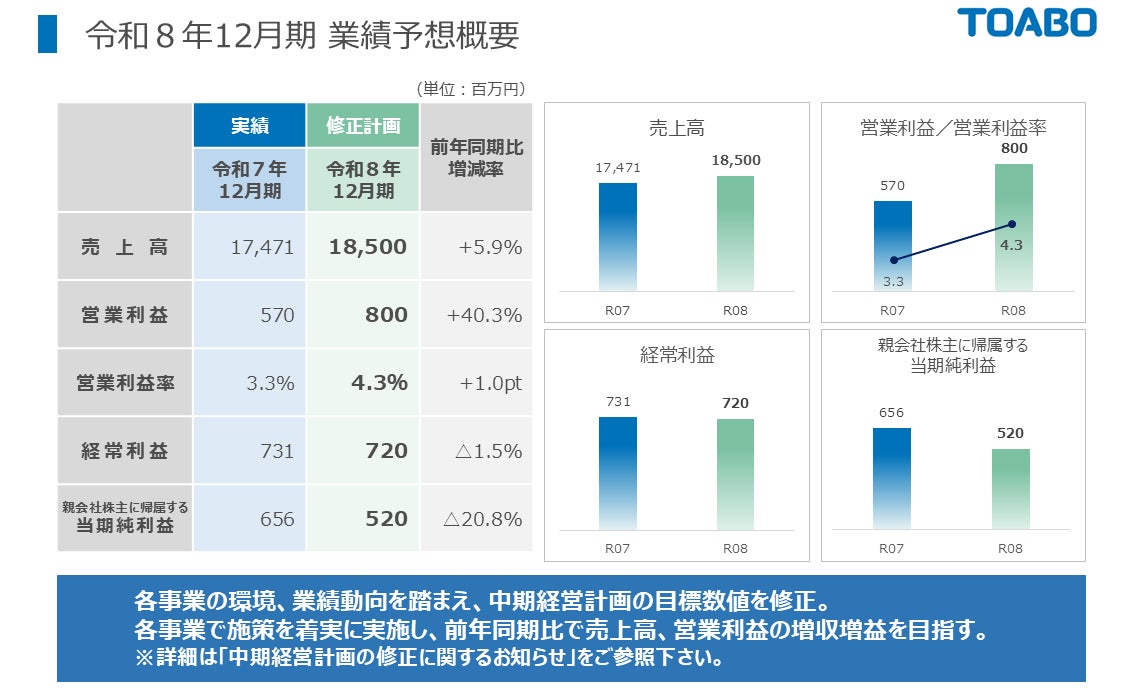 中期経営計画の数値の修正につきましては、当社HP「IRニュース」(https://www.toabo.co.jp/ir/strategy/)に掲載しております「中期経営計画の修正に関するお知らせ」および「中期経営計画の修正に関する添付資料」をご覧ください。