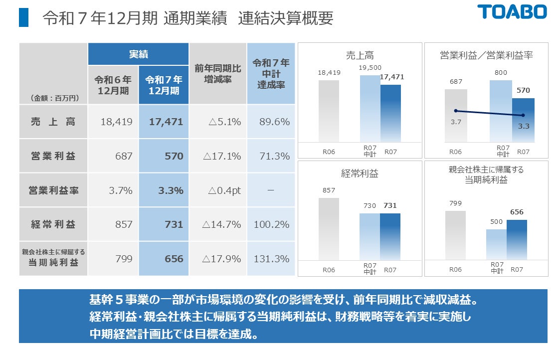 株式会社トーア紡コーポレーション(本社:大阪府大阪市、代表取締役社長:長井渡、東証スタンダード:3204)は、2026年2月13日、令和7年12月期の決算を発表いたしました。
