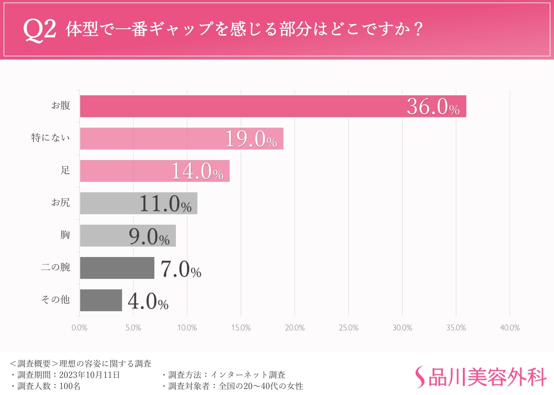 そこで、体型で一番ギャップを感じる部分について伺ったところ、「お腹(36%)」と回答した方が最も多い結果となりました。
