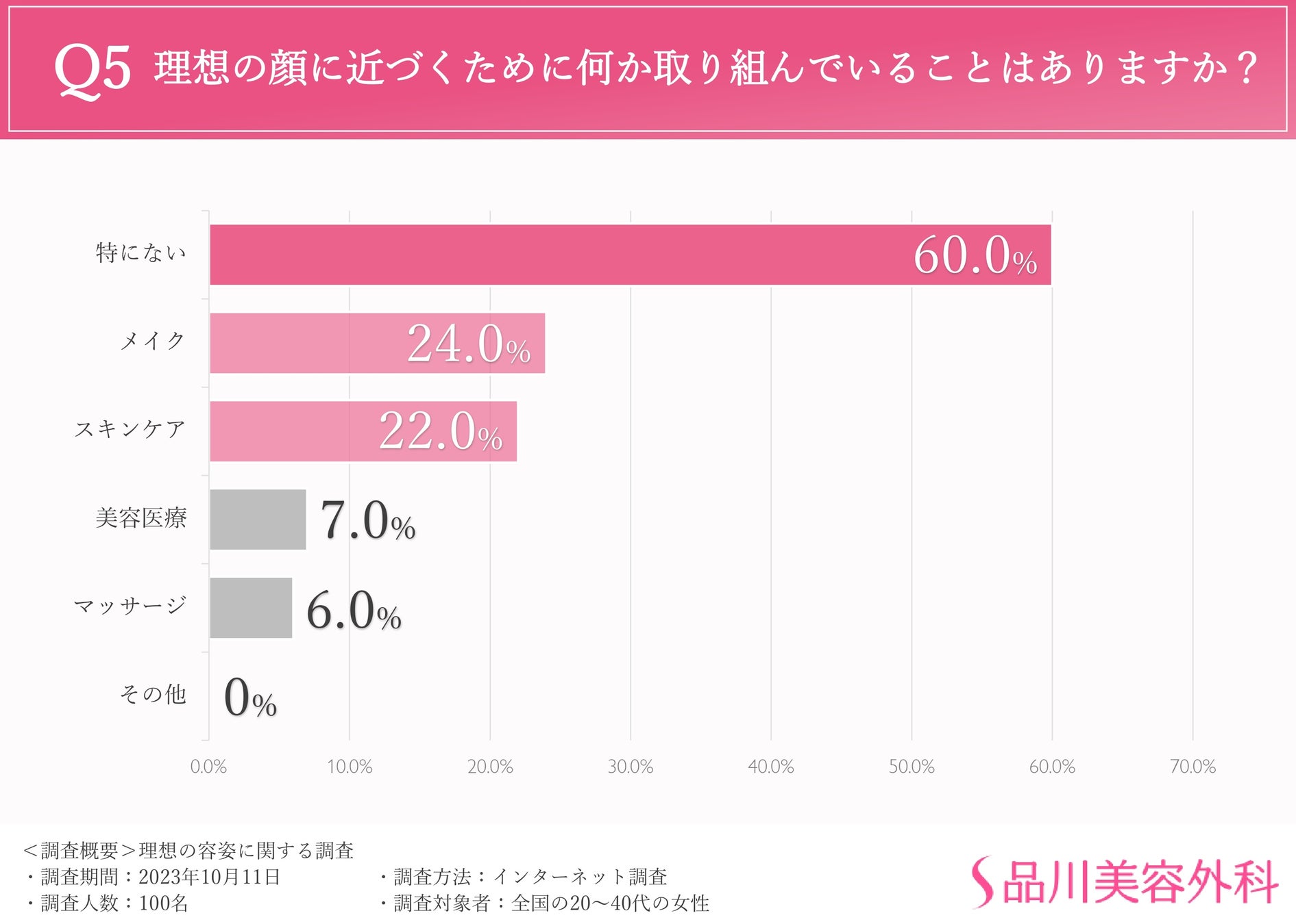 理想の顔に近づくために取り組んでいることについて伺ったところ、「メイク(24%)」と回答した方が最も多い結果となりました。