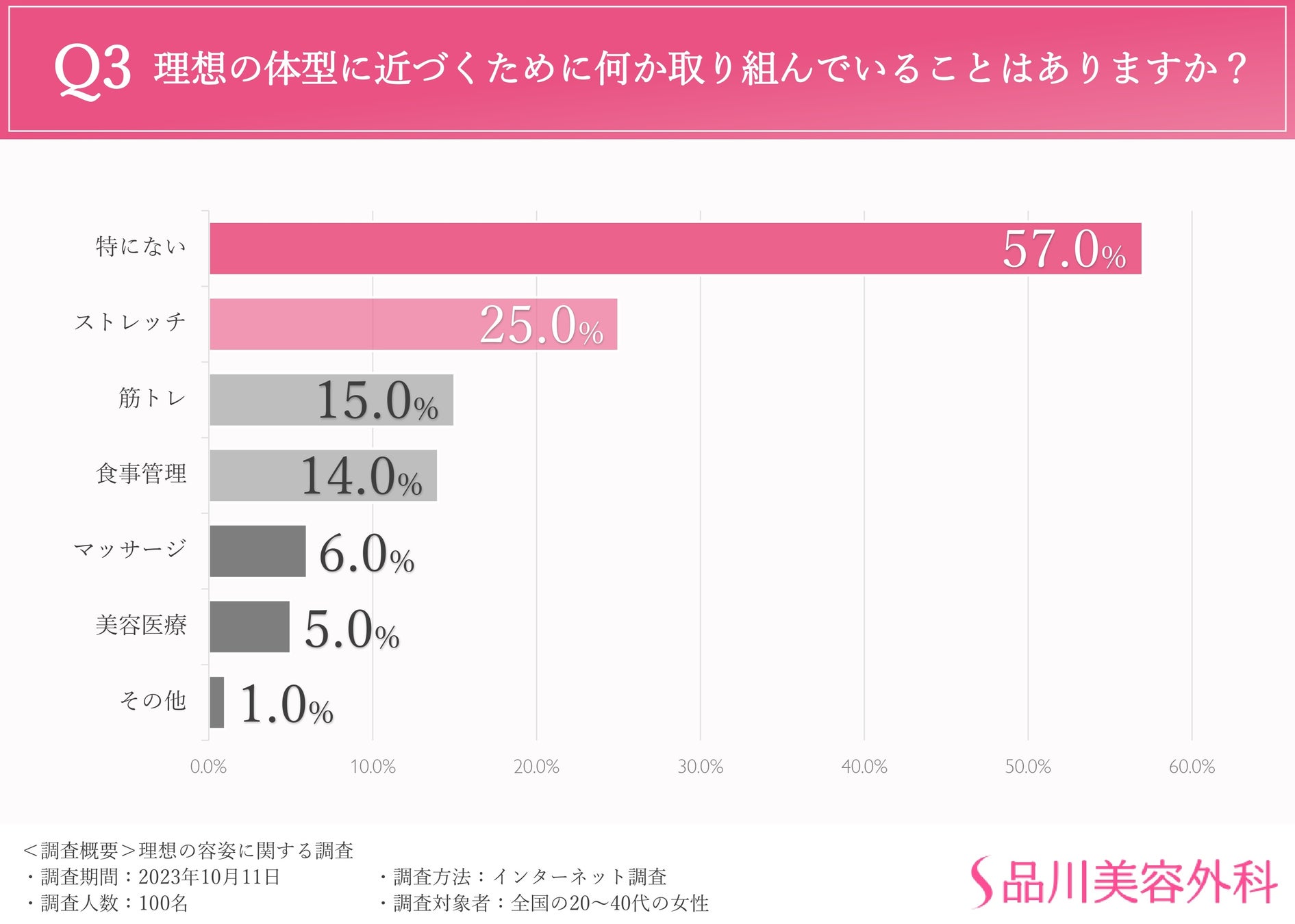 理想の体型に近づくために行っていることについて伺ったところ、「ストレッチ(25%)」と回答した方が最も多い結果となりました。