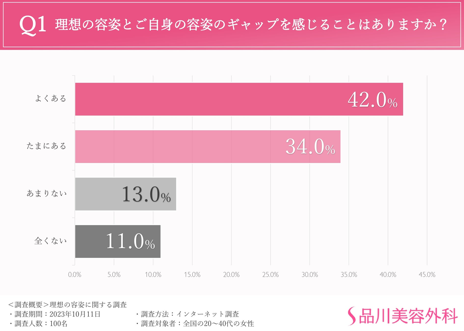 はじめに、理想の容姿と自身の容姿のギャップを感じることがあるか伺ったところ、8割近くの方が「よくある(42%)」「たまにある(34%)」と回答しました。