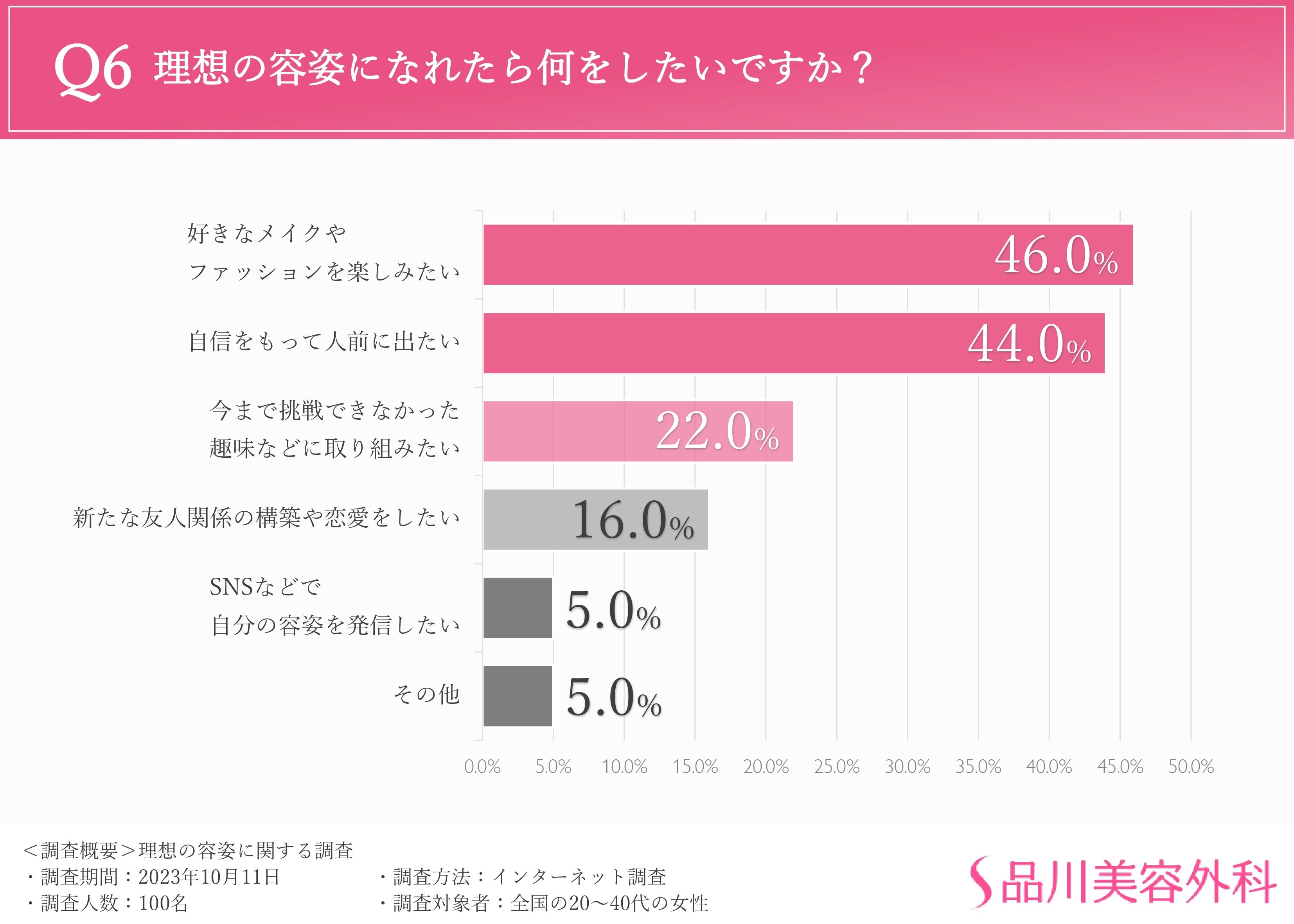 そこで、理想の容姿になれたら何をしたいか伺ったところ、半数近くの方が「好きなメイクやファッションを楽しみたい(46%)」「自信をもって人前に出たい(44%)」と回答しました。
