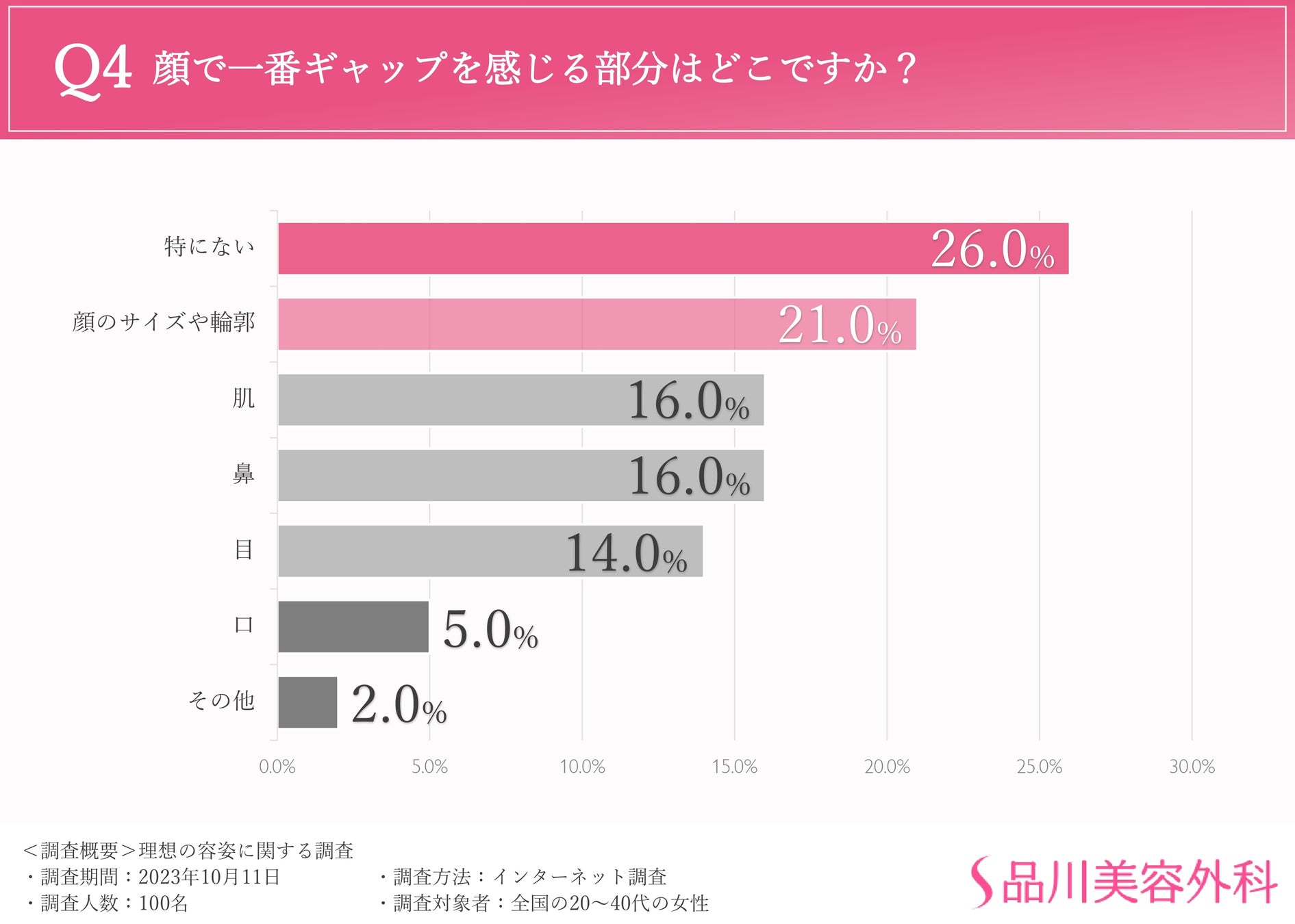 顔で一番理想とのギャップを感じる部分について伺ったところ、「顔のサイズや輪郭(21%)」と回答した方が最も多い結果となりました。