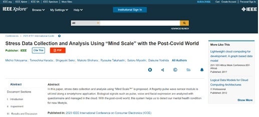 株式会社Yume Cloud Japan(本社:山形大学国際事業化研究センター内、代表取締役 : 吉田大輔、以下Yume Cloud Japan)は、山形大学との共同研究を行っているストレス可視化の研究成果を、2023年1月6~8日にアメリカラスベガスで行われたIEEE 41st International Conference on Consumer Electronicsにて学会発表しました。この研究成果は当社が開発を進めているストレス可視化サービス「マインドスケール」に応用されています。