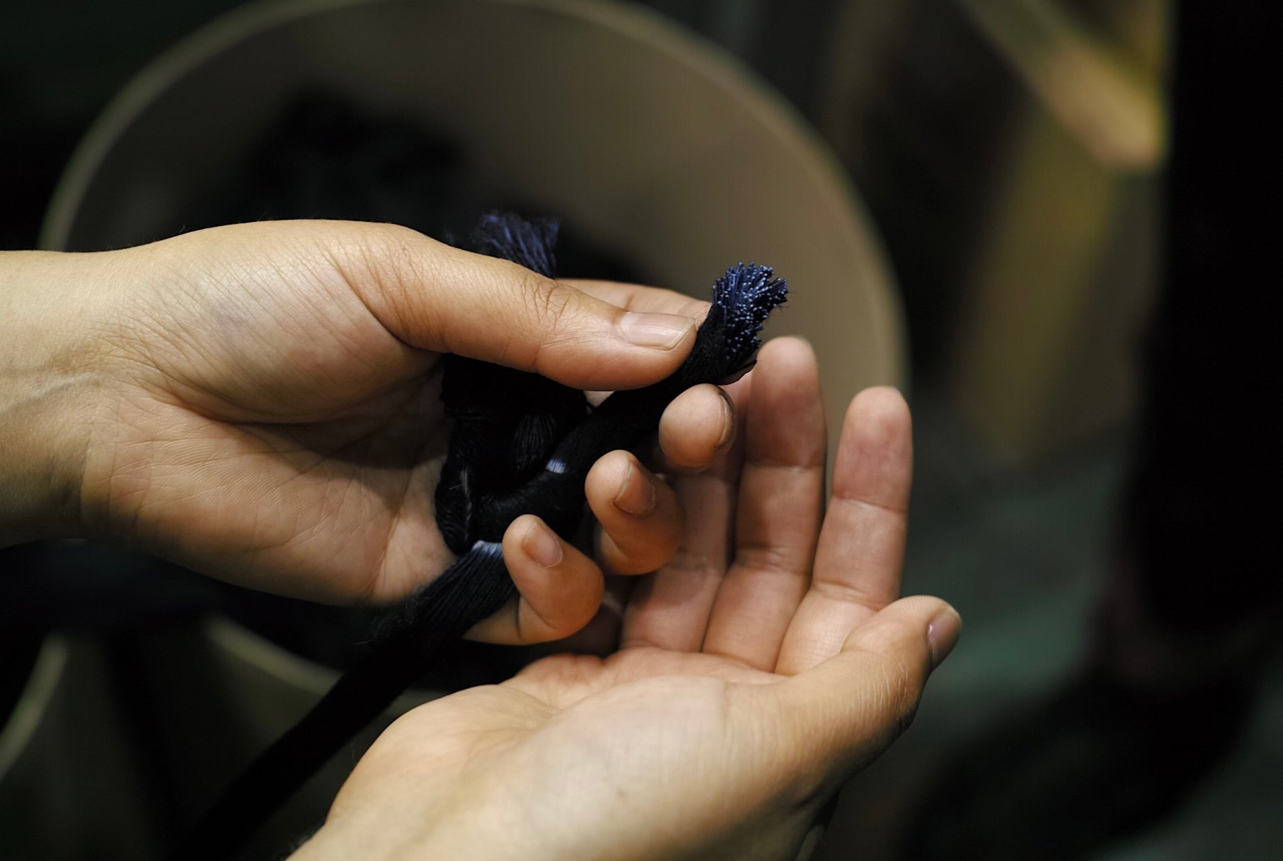 ステテコならステテコ、デニムならデニムの生産に特化した「産地」があり、この「ちぢみデニム ステテコパンツ」は本来であれば交わることのない生産工程をひとつにまとめ上げるという、まだ誰も成し遂げたことのない、産地間の複雑な連携を要するものでした。