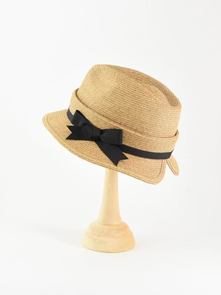 ラフに結んだリボンに加えて、クラウンに折り返しの丸みを持たせたり、バックサイドにスリットを配置することにより、女性らしいシルエットのマニッシュに仕上げました。