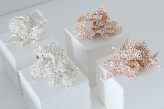 素材は作家が出会った糸とビーズ、淡水真珠や天然石。