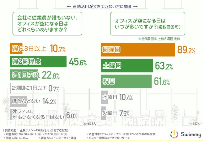 「オフィスが空になる日はいつが多いですか?(複数回答可)」と質問したところ、『日曜日(89.2%)』と回答した方が最も多く、次いで『土曜日(63.2%)』『祝日(61.6%)』と続きました。