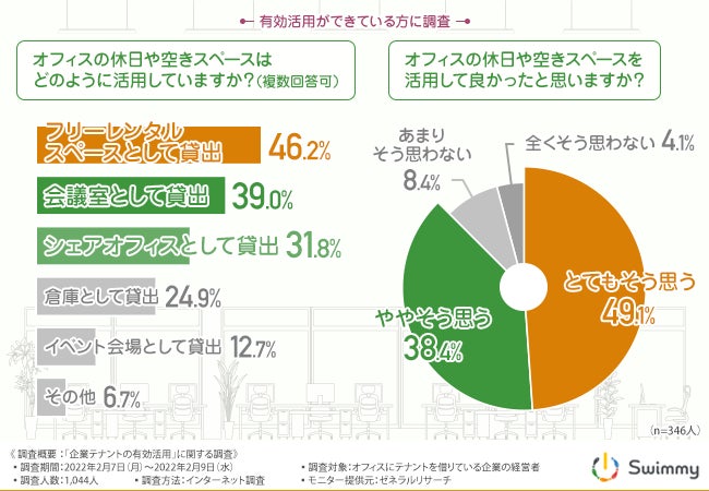 「オフィスの休日や空きスペースを活用して良かったと思いますか?」と質問したところ、9割近い方が『とてもそう思う(49.1%)』『ややそう思う(38.4%)』と回答しました。