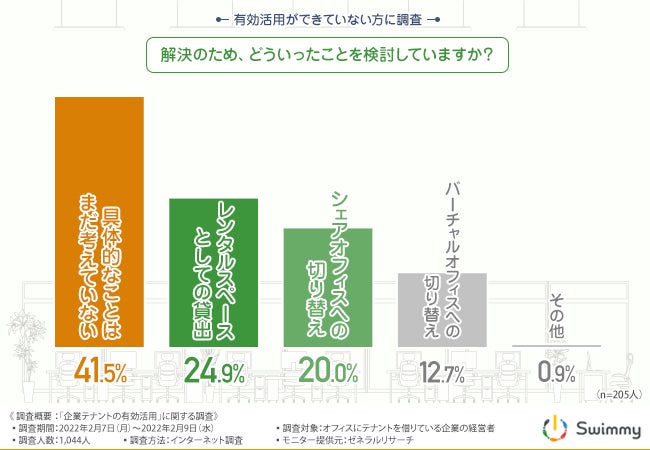 解決を図る経営者に対して「解決のため、どういったことを検討していますか?」と質問したところ、『具体的なことはまだ考えていない(41.5%)』と回答した方が最も多く、次いで『レンタルスペースとしての貸出(24.9%)』『シェアオフィスへの切り替え(20.0%)』と続きました。