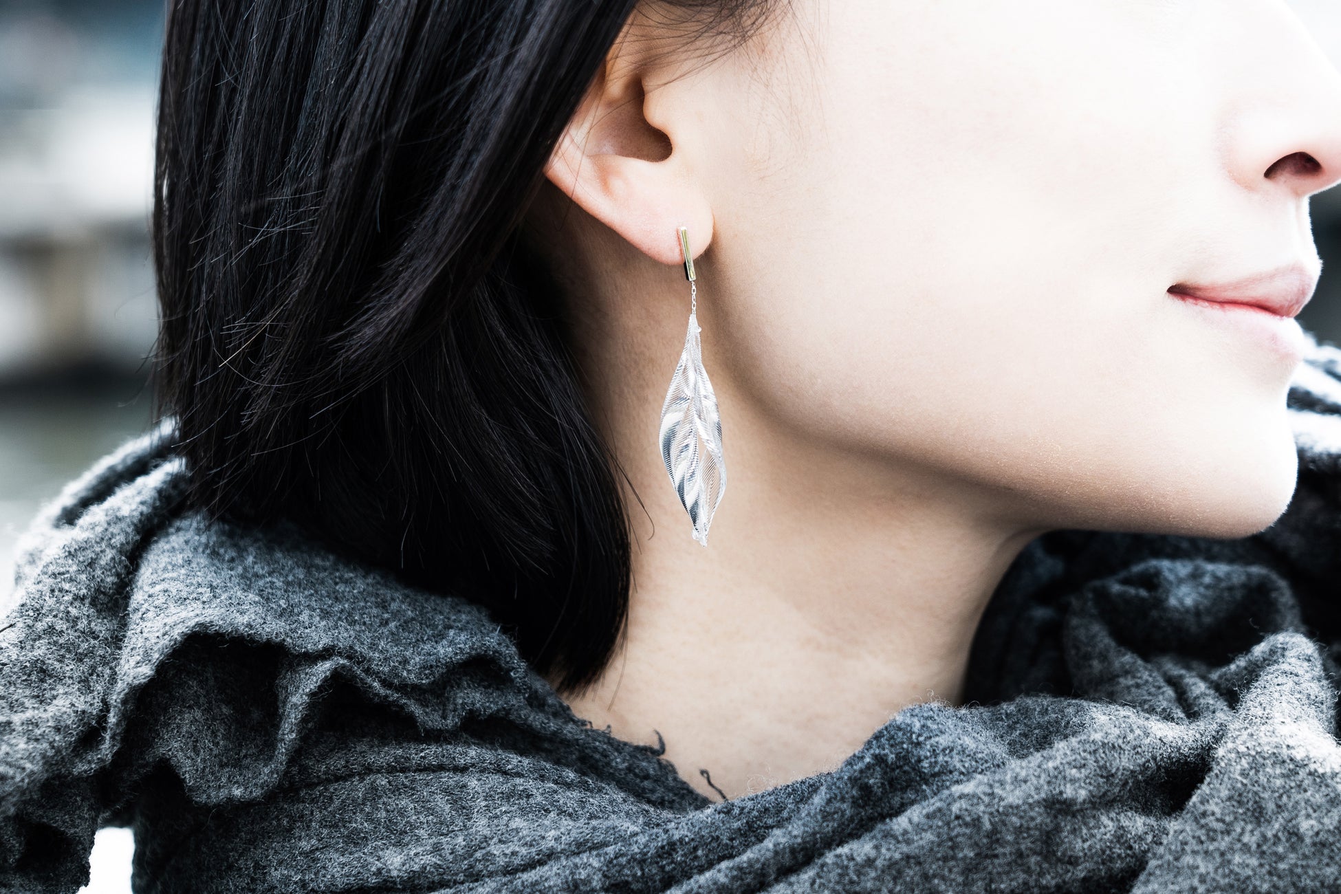 無垢に輝く水滴が落ちる瞬間の形、「雫」をモチーフにしたエレガントなピアス。軽やかな美しさと、日常に馴染む使いやすさをかね備えた、アイコニックなアートジュエリーです。無垢のガラスのように存在感のある輝きを持ちながらも、重さはわずか1グラム。耳に全く負担をかけないので、長時間ストレスなくご着用いただけます。