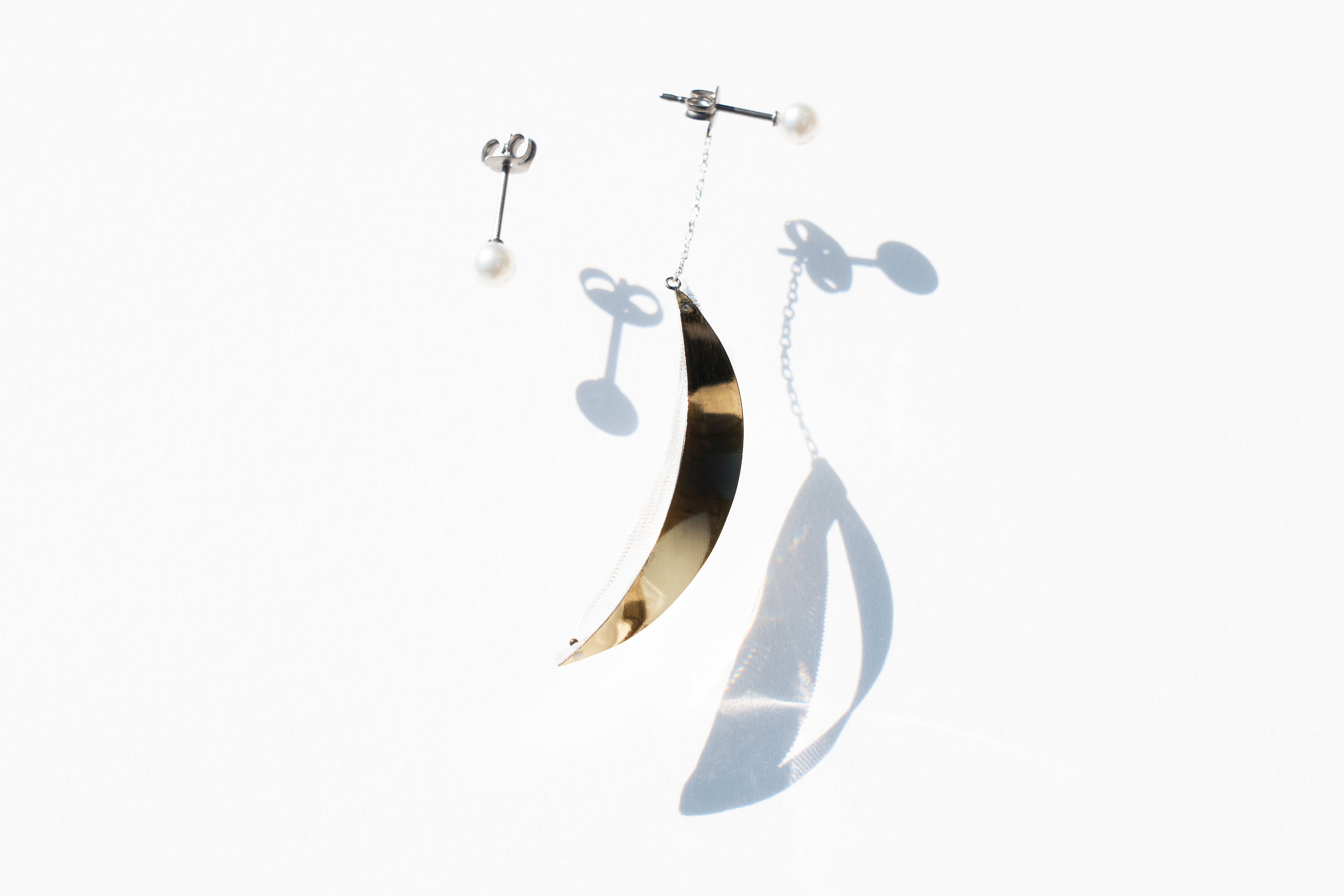 月の満ち欠けのように、優美な光をとどめる詩的なピアス。プリズムとチタンによる三日月の立体的なフォルムと、満月をイメージしたアコヤパールがあしらわれた曲線が美しいジュエリーです。重さは1g以下と超軽量で軽やかな雰囲気。耳元でチャーミングにゆれながら、太陽の光を受けて、輝く月のように柔らかに光ります。
