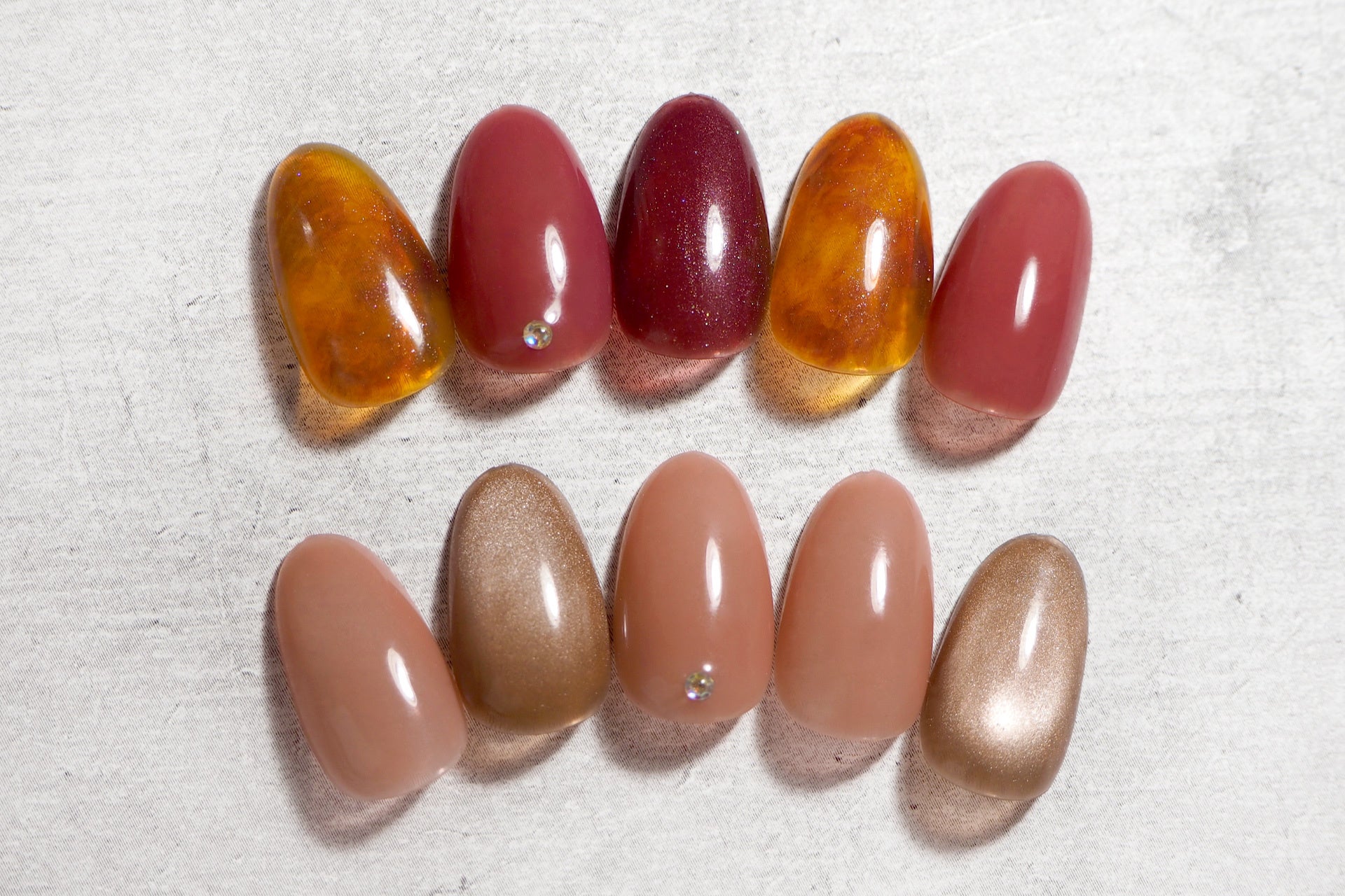 秋の豊かな収穫を思わせる、まろやかで甘みのあるブラウンのネイルです。ナチュラルでありながらもリッチな印象に。