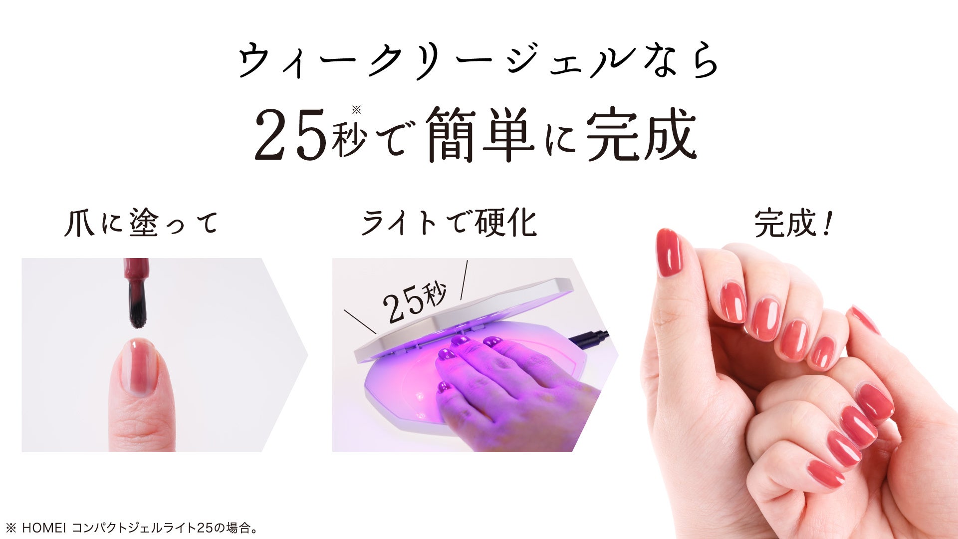 塗って、ライトで固めるだけの簡単2STEPで、本格的なつやつやぷっくりネイルが楽しめる「ウィークリージェル」。