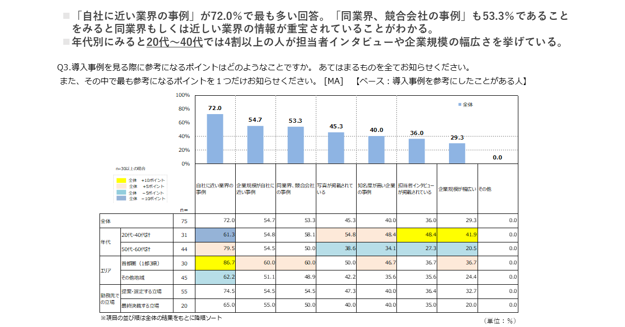 【マーケティング調査】サービスを検討する際に約64%が「導入事例を参考にする」と回答、最も求められるのは「自社に近い業界の事例」