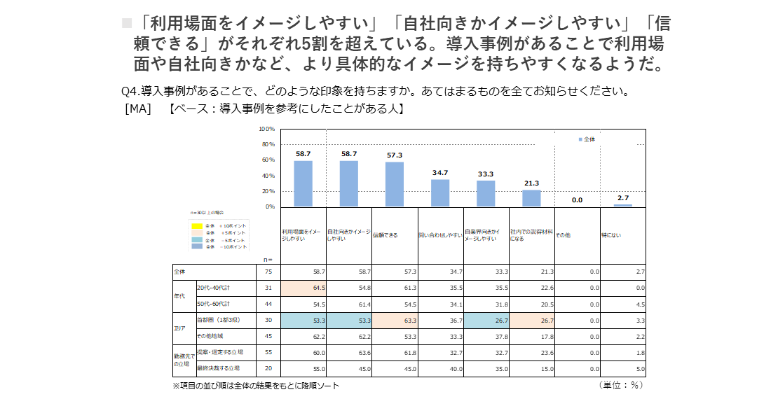 - 具体的な利用場面や自社向きかどうかをイメージさせることに役立っている。