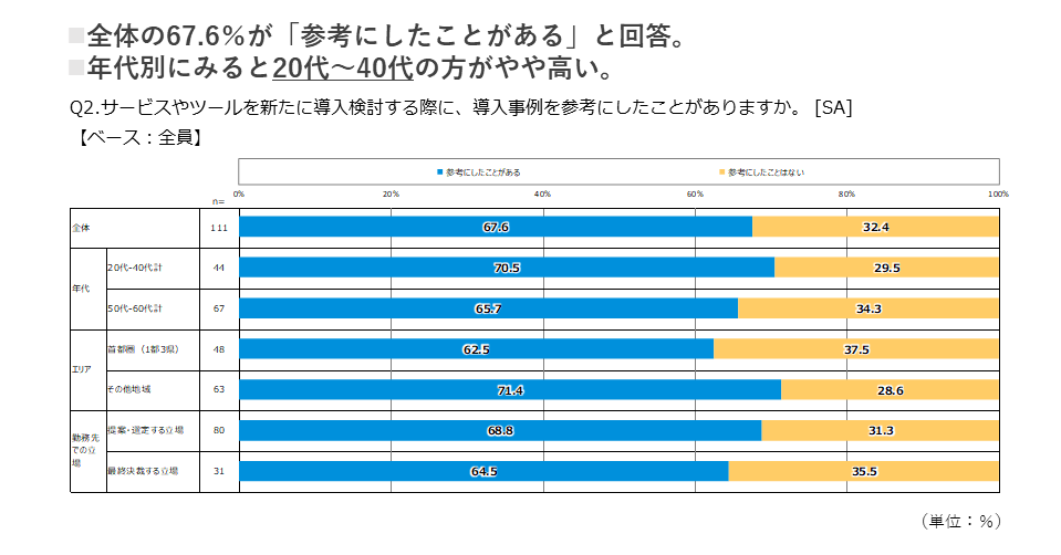 また「Q2.サービスやツールを新たに導入検討する際に、導入事例を参考にしたことがありますか。(単一回答)」(n=111)と質問したところ、全体の67.6%が「参考にしたことがある」と回答しました。年代別にみると20代~40代の方がやや高い傾向にあるようです。