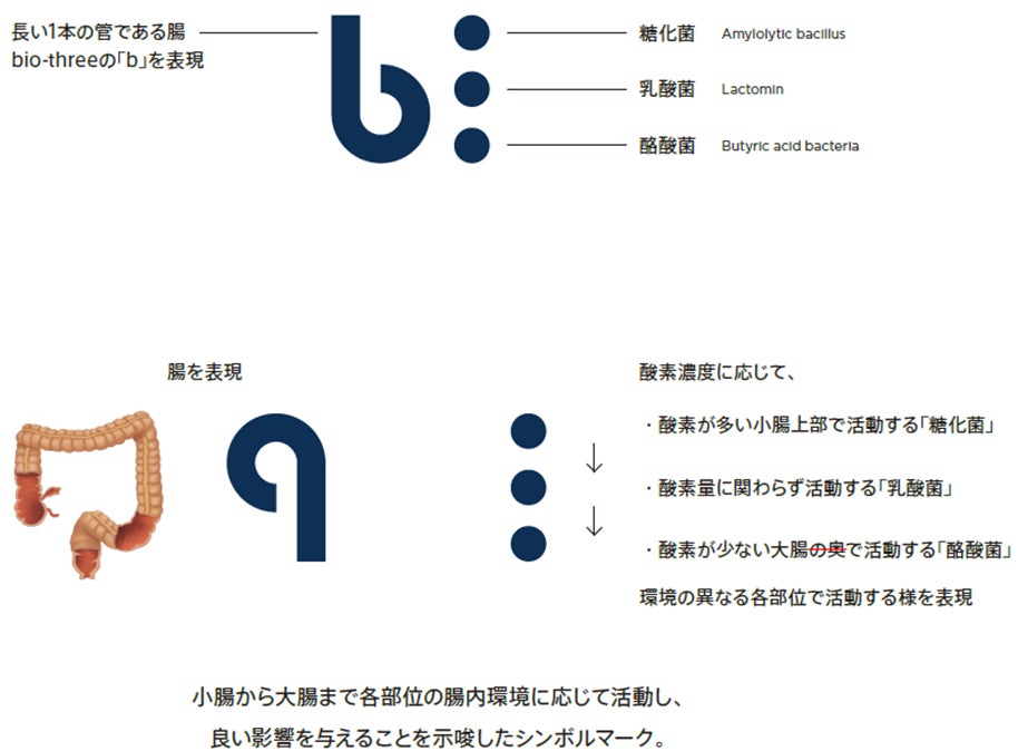 ・ シンボルマークは「ビオスリー」の「b」と長い1本の管である「腸」のイメージをモチーフに、また3つの丸は、糖化菌・乳酸菌・酪酸菌が小腸から大腸まで各部位の腸内環境に応じて活動し、良い影響を与えることを示唆しています。