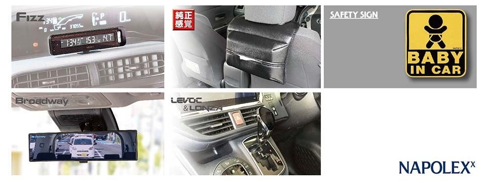 ナポレックス事業部について:カー用品の製造販売として1947年より歴史を築いてきた老舗メーカー。「赤ちゃんが乗っています/BABY IN CAR」でお馴染みのセーフティサインをはじめ、代表的なブランドでは「FIZZ」「Broadway」、まるで純正オプションかのようなデザインが好評の「純正感覚」など、ユーザーの細かいニーズを満たし、カーライフを豊かにするアイテムを生み出し続けてきました。また、「ディズニーキャラクター・カーグッズコレクション」として、ミッキーマウス、ミニーマウスをはじめスターウォーズのダース・ベイダー、その他MARVELブランドのグッズ、大きな目が特徴的なカーズのサンシェードなどを企画・販売しています。