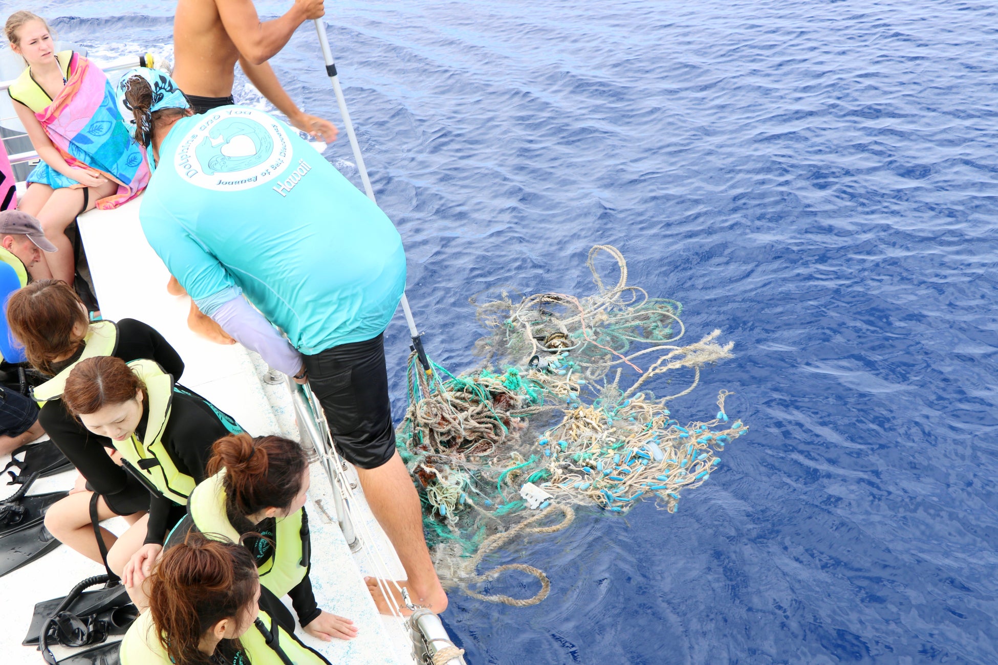 また、ツアー中には「マラマハワイ(ハワイをいたわる活動」を実践しています。アンドユークリエーションズの海で行うツアー(ドルフィン&ユー/イルカウオッチングツアー、タートル&ユー/ウミガメとスノーケリング、オーシャン&ユー/サンセットクルーズ)では、海に漂う浮遊ゴミを見つけ次第、回収しています。また、陸で行うツアー(ネイチャー&ユー/マノアの滝ツアー、ワイメアの滝ツアー、アイランド&ユー/オアフ島周遊ツアー)では、ガイドが訪れた場所でゴミを回収したり、自然に帰る生分解性プラスチックを使用指定いただくよう取引先に呼びかけ変更していただいたりしています。