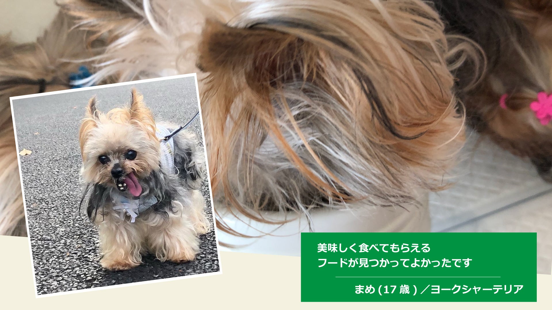 慢性腎臓用の療法食は美味しくないものが多いのか、全く食べてくれないものがほとんどでしたが、yum yum yum! 健康マネジメント腎臓は気に入って食べてくれているので嬉しいです。粒が極小粒で食べやすそう。美味しく食べてもらえるフードが見つかってよかったと思っています。(まめちゃん 17歳/ヨークシャーテリア)