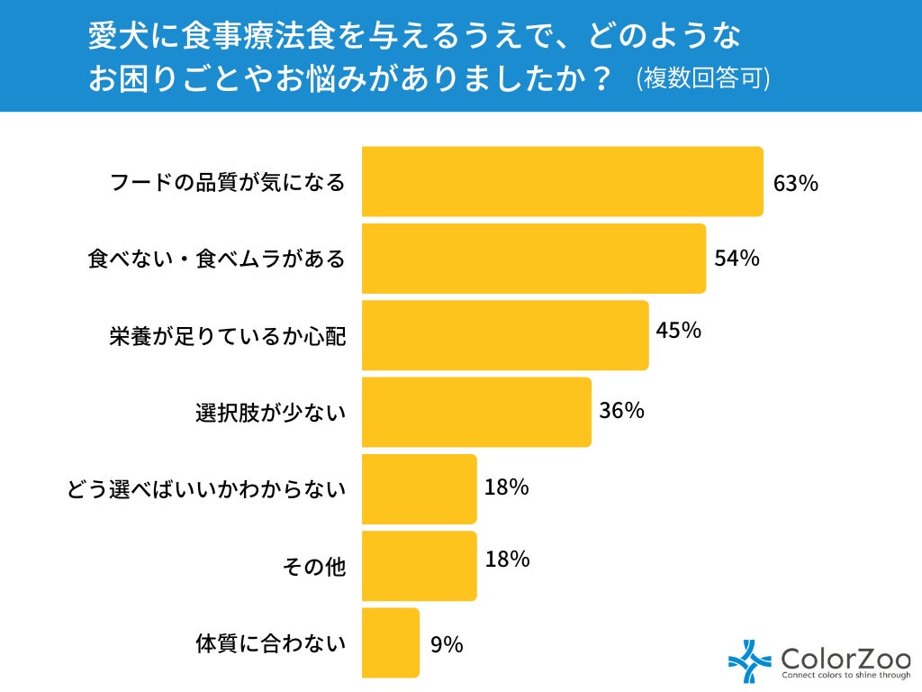 お悩みは『フードの品質が気になる (63%)』と回答した方が最も多く、次いで『食べない、食べムラ(54%)』『栄養が足りているか心配になる (45%)』『選択肢が少ない(36%)』と続き、食事療法が必要な一方でお悩みの種類も多様であることがわかります。(※1)