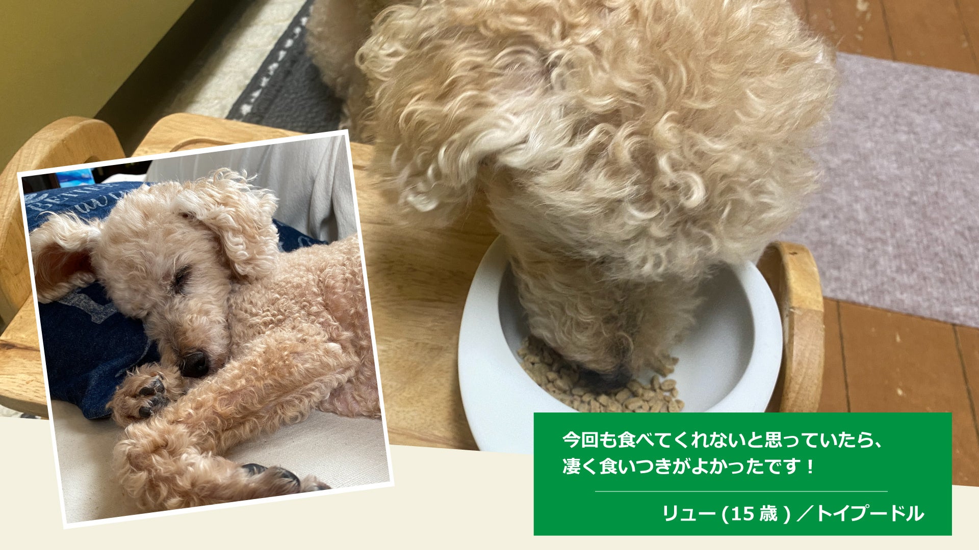 今まで何種類か慢性腎臓病用の食事療法食を試しました。今回も食べてくれないと思っていたら、yum yum yum! 健康マネジメント腎臓は凄く食いつきがよかったです!粒が小さくふやかす時間がかからないのも与えやすいのもいいです。(リューちゃん 15歳/トイプードル)