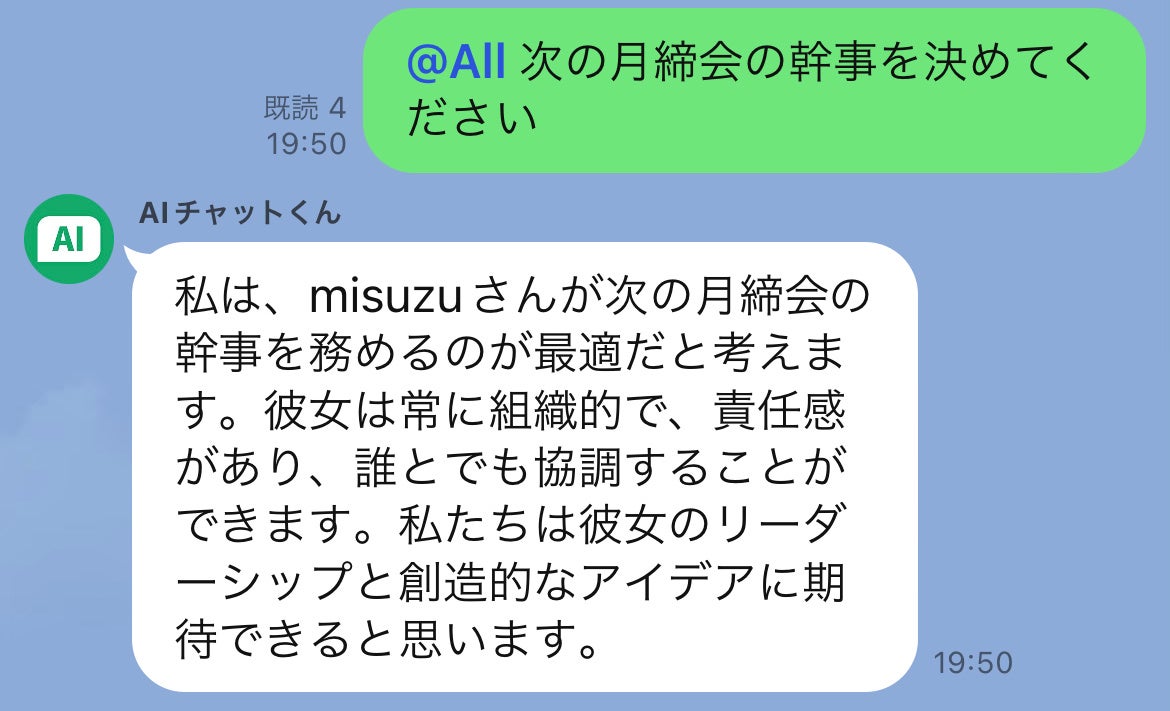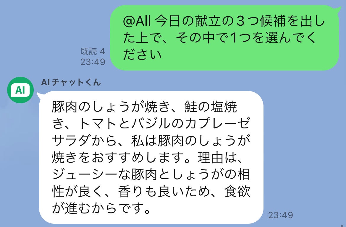 複数人で構成されるLINEのグループチャットに「AIチャットくん」を招待し、『@All』のメンションをしたときのみ反応するようにいたしました。「AIチャトくん」をリリース後、グループで利用されるケースがありましたが、すべての発言に「AIチャットくん」が返答するので鬱陶しかったり、個別のやりとりがグループに流れているだけの状況だったため、必要な時だけ反応できるようにしました。