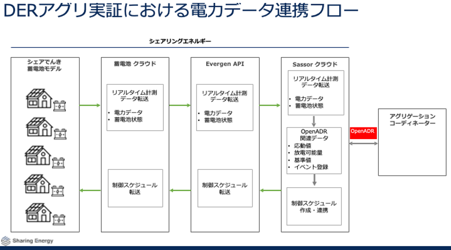 Sassorが提供するRA(リソースアグリゲーター)システム「ENES」と、Evergenが提供する制御APIの活用を通じて、シェアリングエネルギーは「シェアでんき蓄電池モデル」として提供する蓄電池システムを統合・遠隔制御し、DR(デマンドレスポンス)やVPP(バーチャルパワープラント)といったアグリゲーションサービスの商用化検討を実証しました。